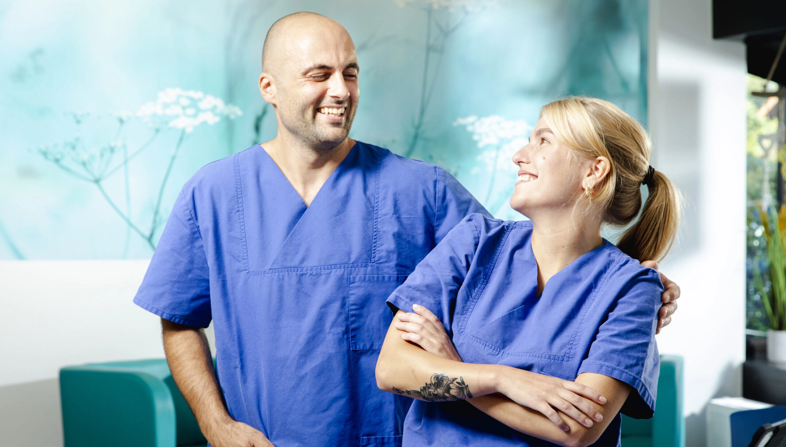 Zwei Personen in blauer medizinischer Arbeitskleidung stehen in einem Krankenhausflur; eine Person legt spielerisch den Arm um die andere.